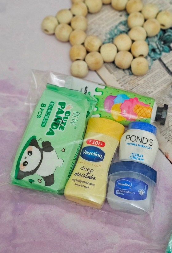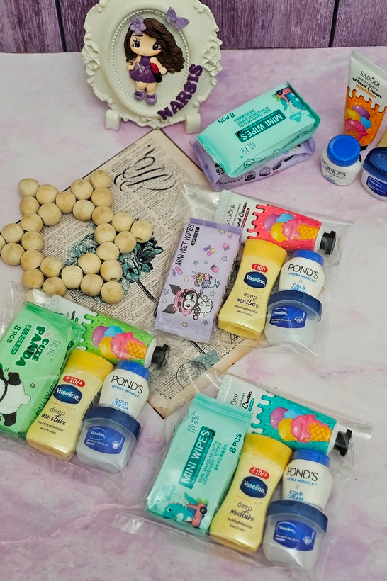 شامل:دستمال مرطوب ،لوسیون بدن وازلین ،بالم لب وازلین،آبرسان مینی پوندز،کرم جیبی بستنی