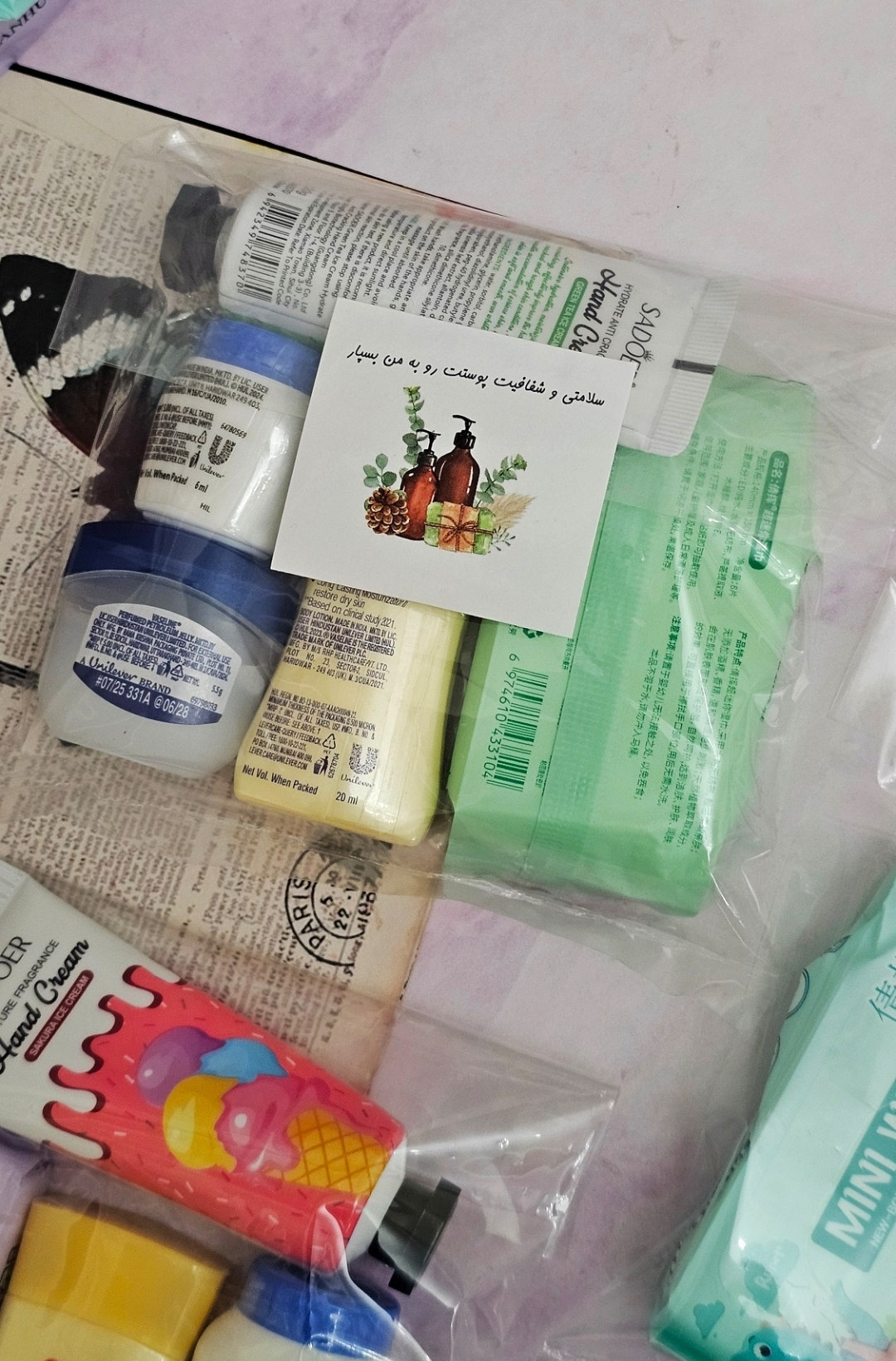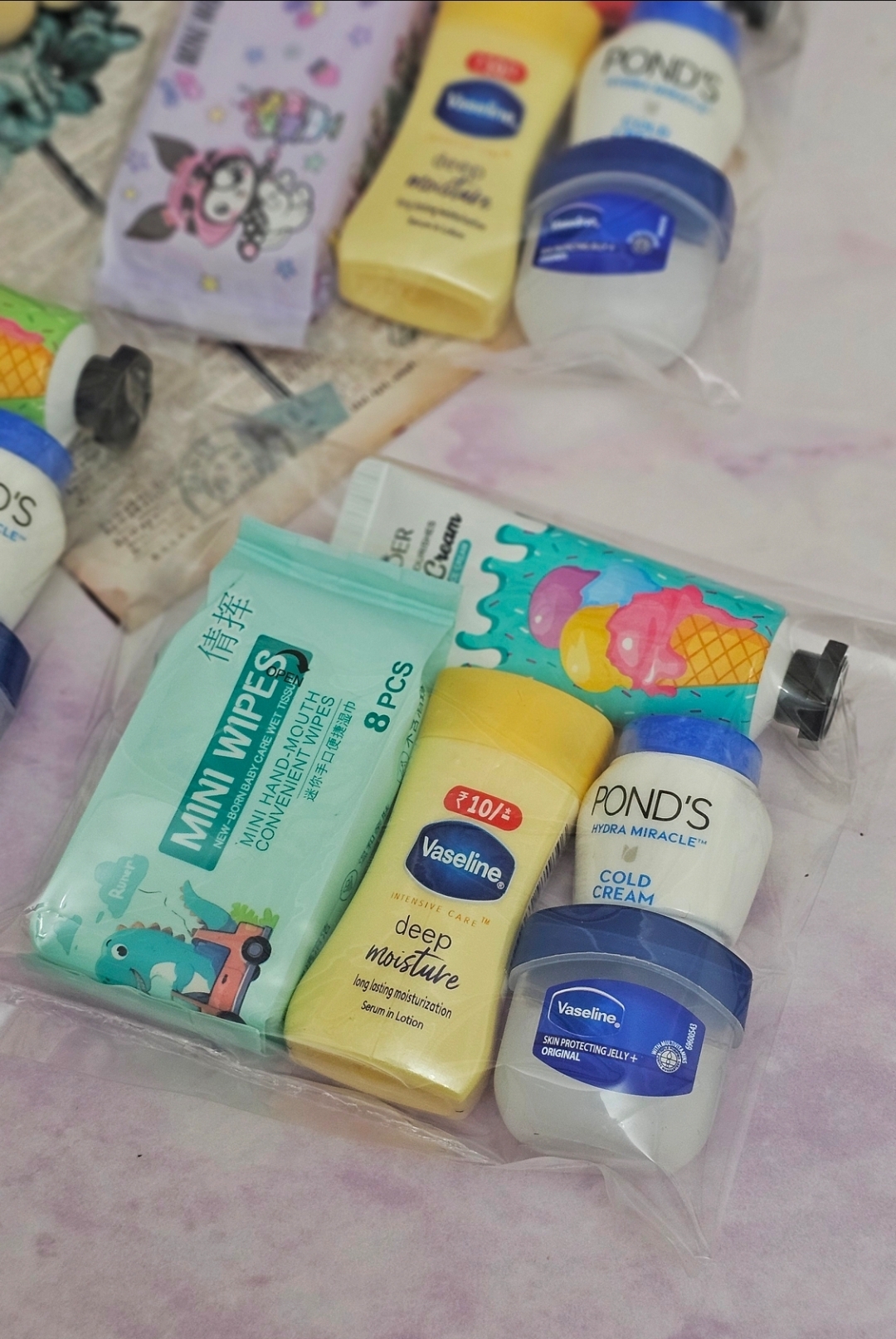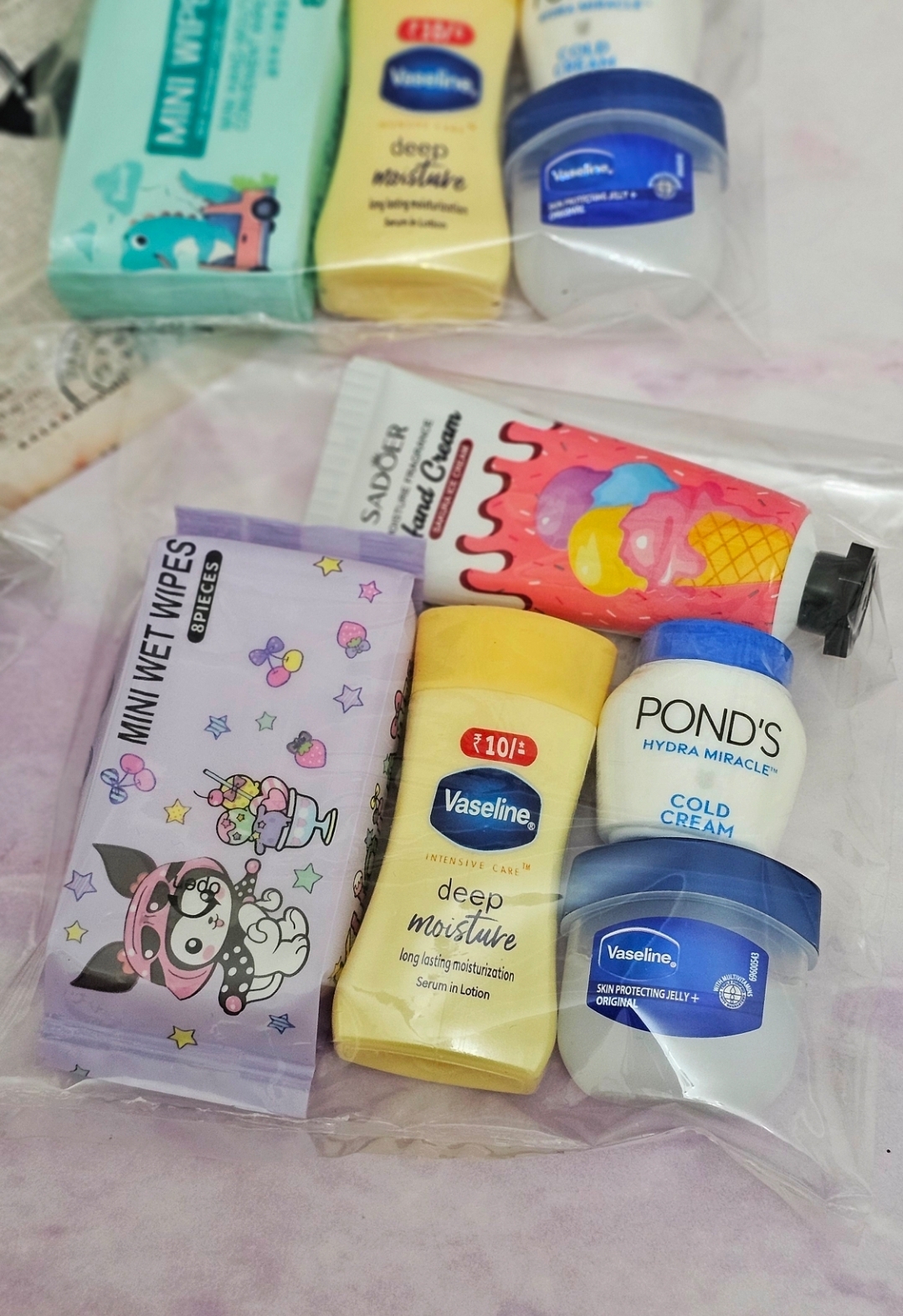 شامل:دستمال مرطوب ،لوسیون بدن وازلین ،بالم لب وازلین،آبرسان مینی پوندز،کرم جیبی بستنی